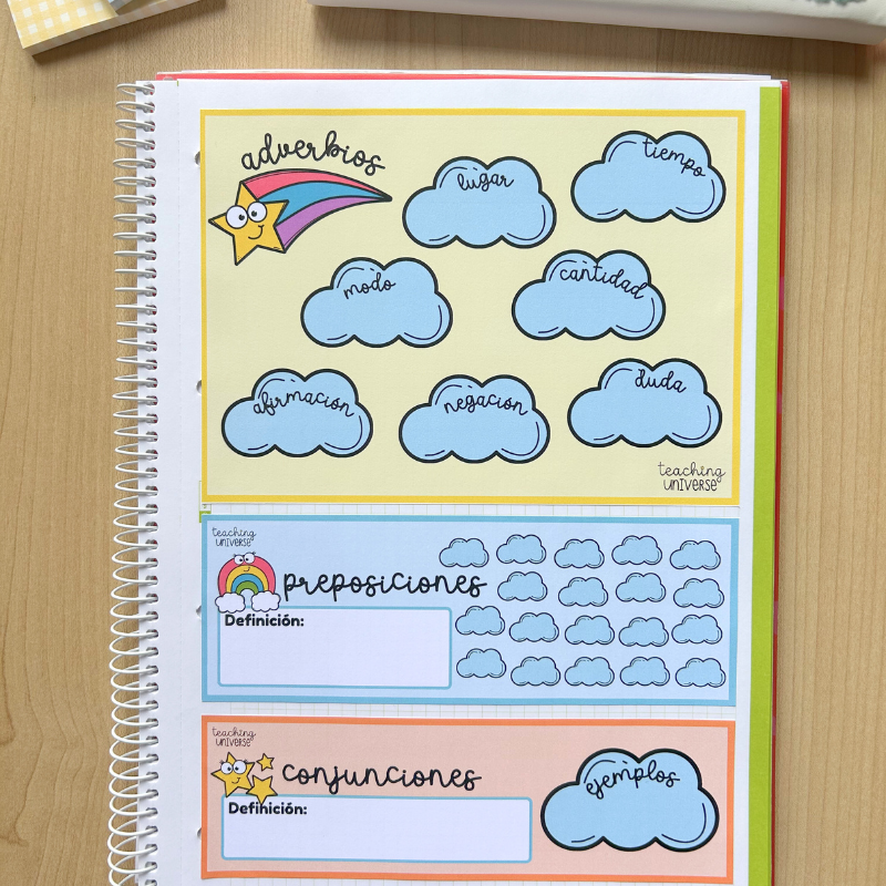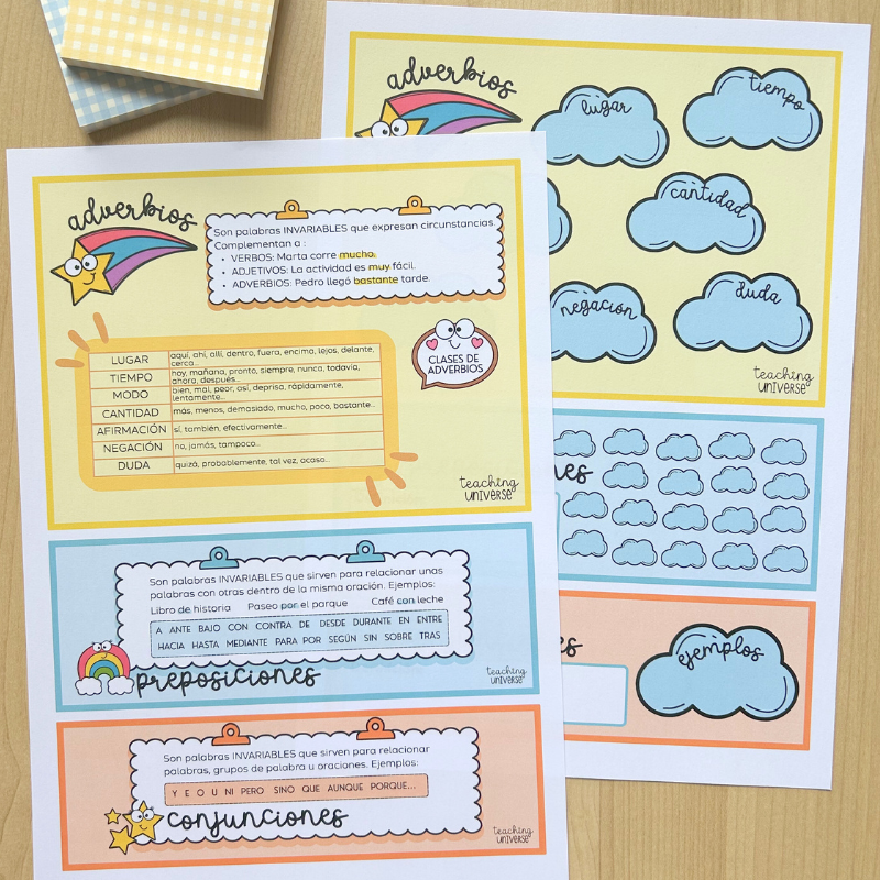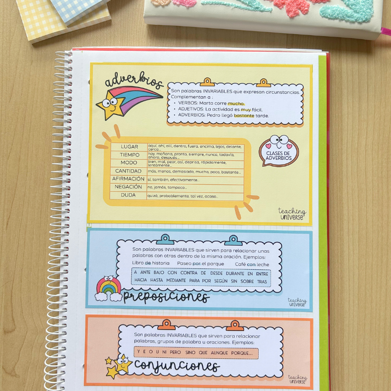 Este recurso está pensado para trabajar adverbios, preposiciones y conjunciones de forma visual, clara y sencilla.