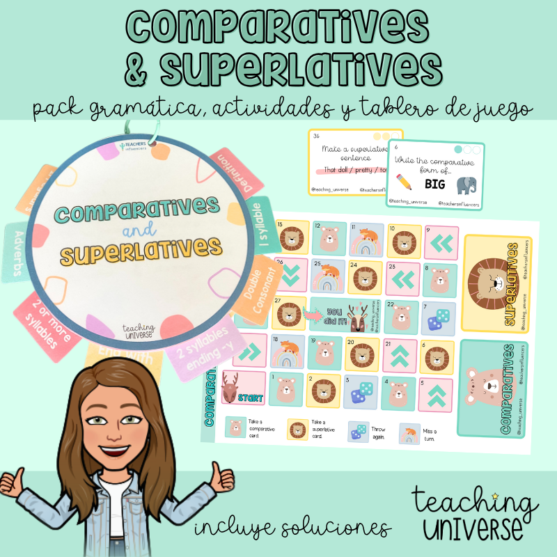 Pack de recursos imprimibles de inglés diseñado para trabajar las normas básicas de los comparatives & superlatives de forma clara, visual y práctica en educación primaria. Un material completo que combina explicación teórica y práctica a través del juego.