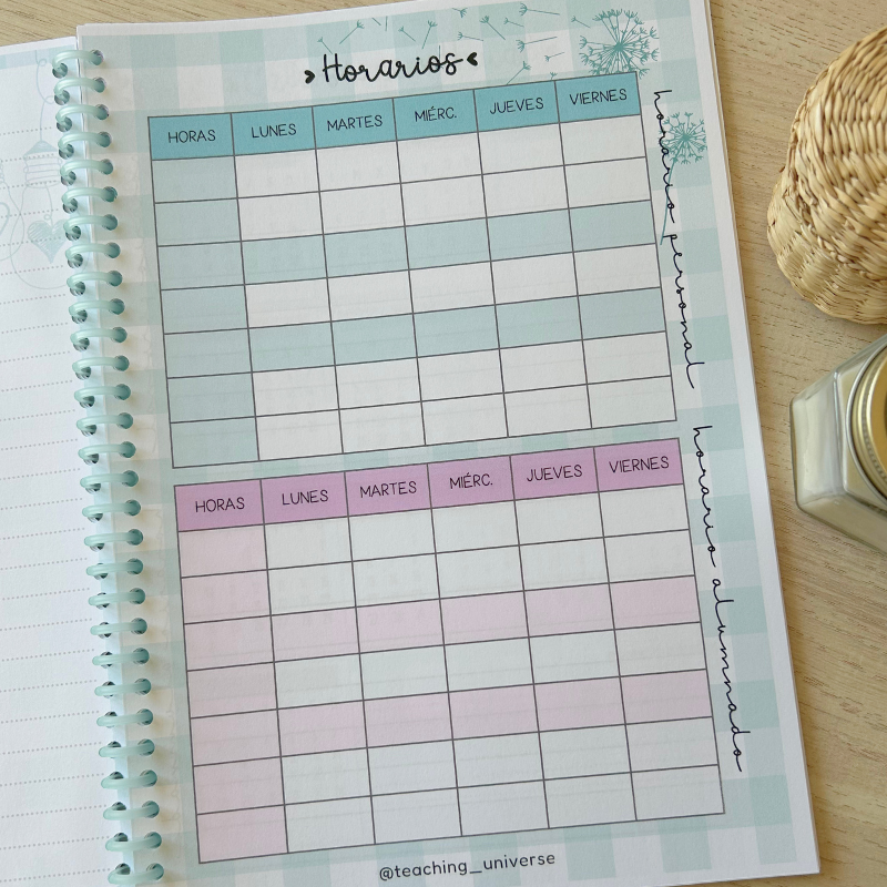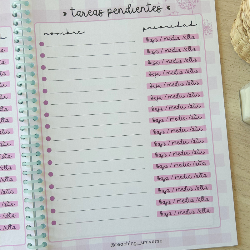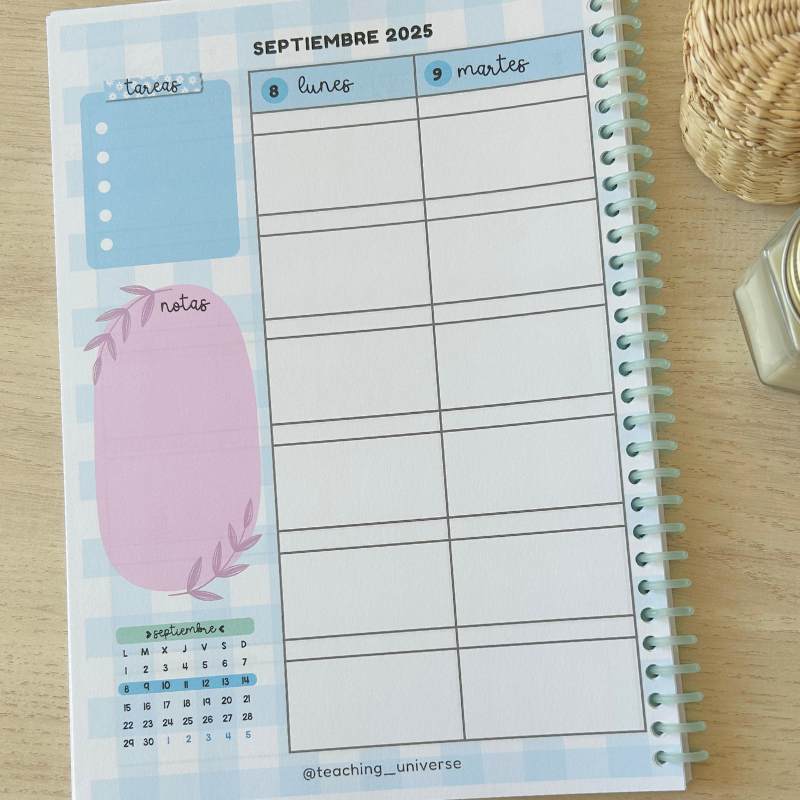 - Programación semanal a semana vista con tareas, notas y calendario. Desde septiembre hasta junio.