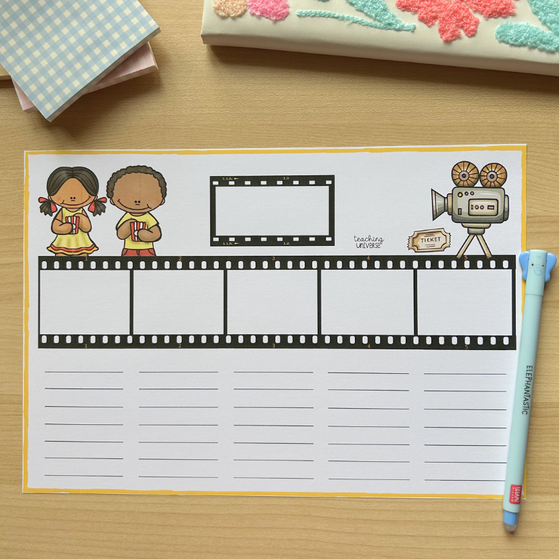 En esta plantilla, dibujan las escenas y escriben un pequeño texto en cada una. Esto facilita mucho la expresión escrita, ya que el dibujo sirve de apoyo visual y reduce el miedo a la hoja en blanco.