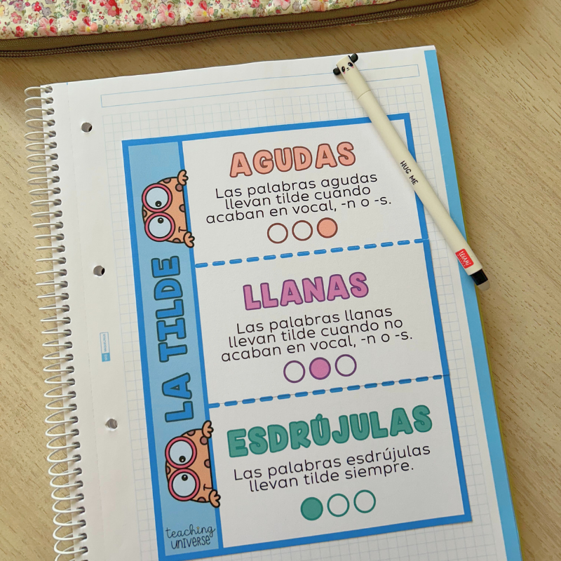 Este recurso contiene un desplegable para trabajar las palabras agudas, llanas y esdrújulas. Puedes descargarlo en blanco y negro o color y también viene preparado para impresión en A4 o A5.