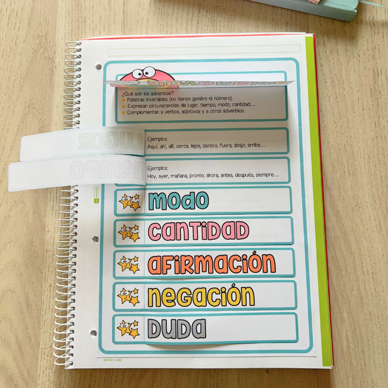 Este completo recurso te permitirá trabajar de forma clara y visual los diferentes tipos de adverbios. Incluye un desplegable para el cuaderno interactivo, disponible con información y en versión vacía para completar con la definición y ejemplos de cada clase de adverbio.