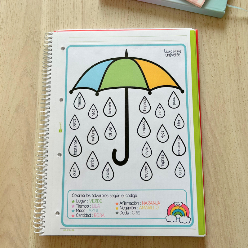 También encontrarás una actividad para colorear según código de color, en la que el alumnado debe identificar y colorear los adverbios según el grupo al que pertenecen. Además, se incluyen soluciones para facilitar su uso en el aula o en casa.