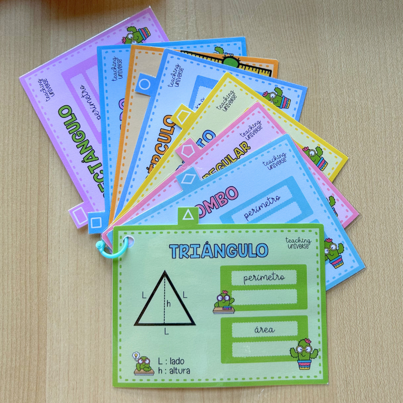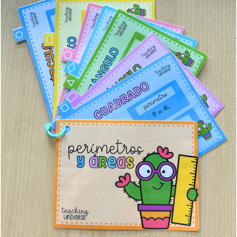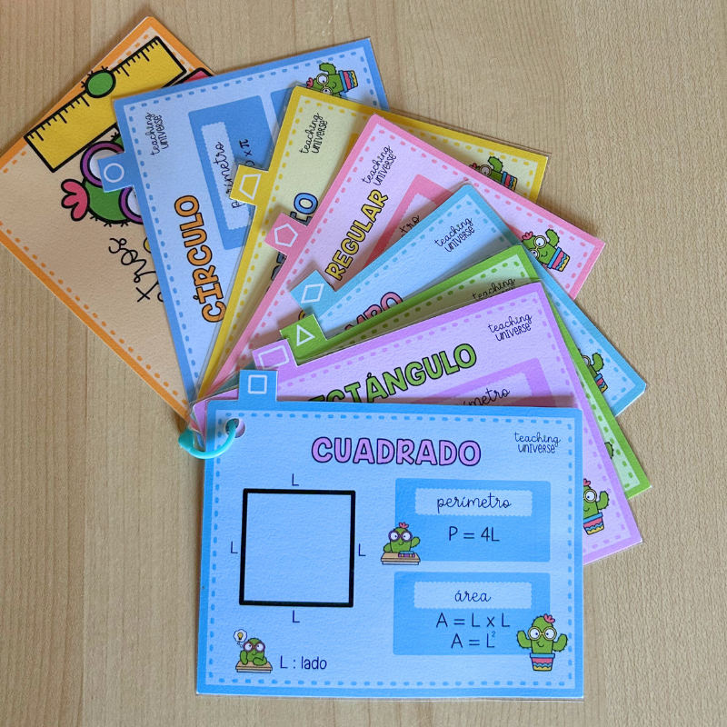 Material didáctico imprimible en formato llavero, pensado para tener siempre a mano las fórmulas de perímetros y áreas de las principales figuras geométricas. Es un recurso muy práctico para consulta rápida, refuerzo y repaso en el área de matemáticas, tanto en el aula como en casa.