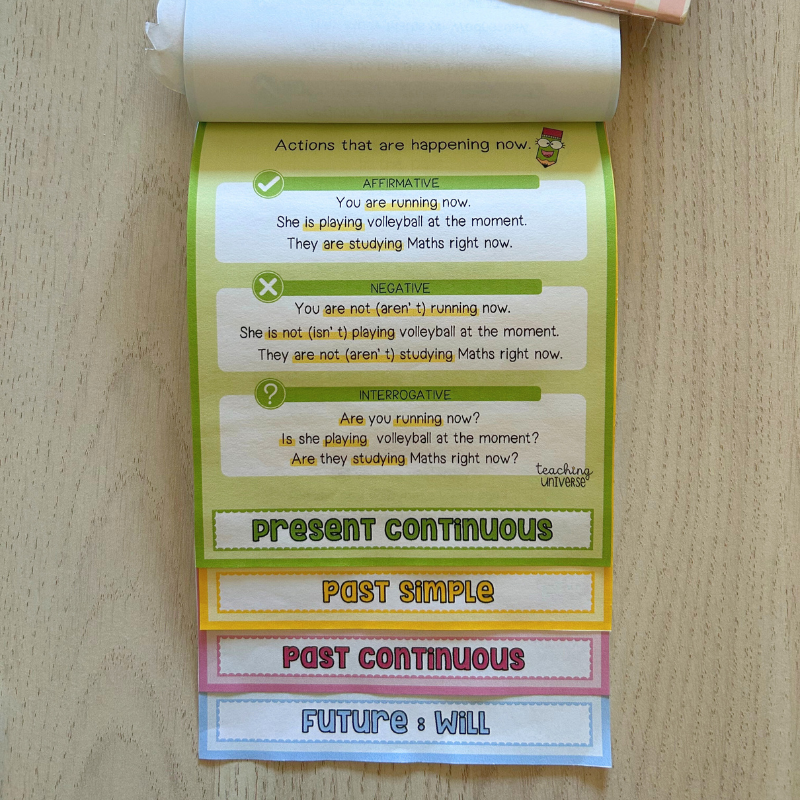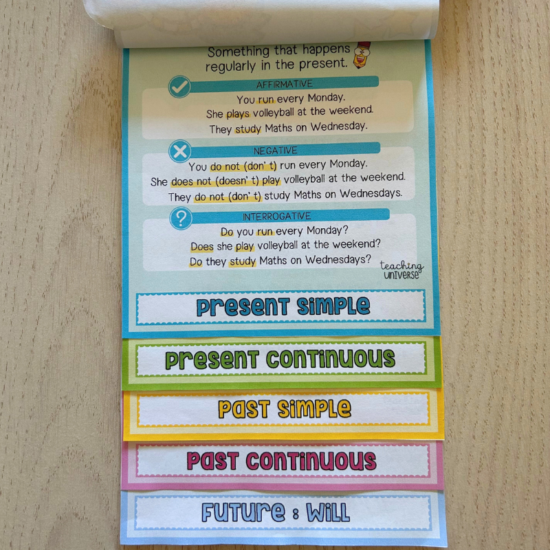 Con este desplegable práctico tendrán siempre a mano una guía visual para repasar los principales usos de los tiempos verbales y practicar en contexto con oraciones afirmativas, interrogativas y negativas.